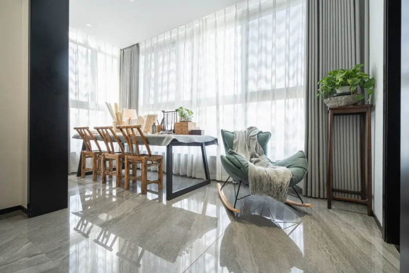 在有限的空间凸显大格局,这个“家居放大术” 的秘籍就在饰材的选择上。在挑选瓷砖的时候,屋主张女士选用1800×900mm大规格的砂岩深灰岩板进行铺贴, 厚重大气的纹理质感,不需要太多的色彩和装饰,就能营造出新中式那种自然与居室和谐共生之境,带来不一样的视觉开拓效果。
